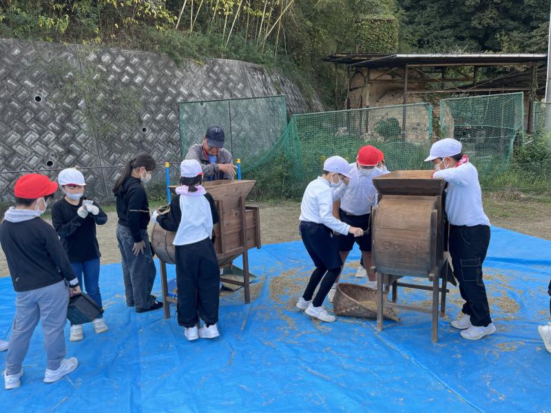 10月27日沼田東小学校 5年生米作り体験学習会で、脱穀作業を行いました。
