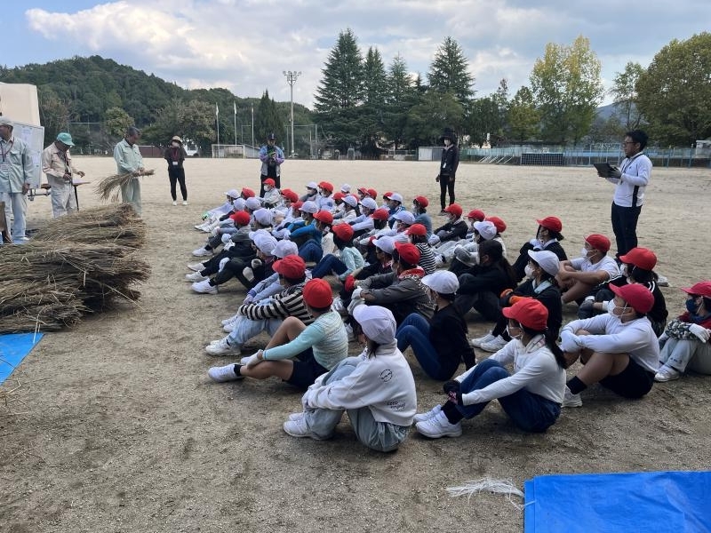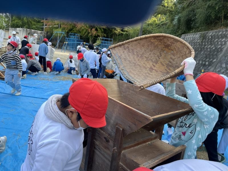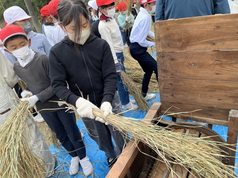 10月27日沼田東小学校 5年生米作り体験学習会で、脱穀作業を行いました。
