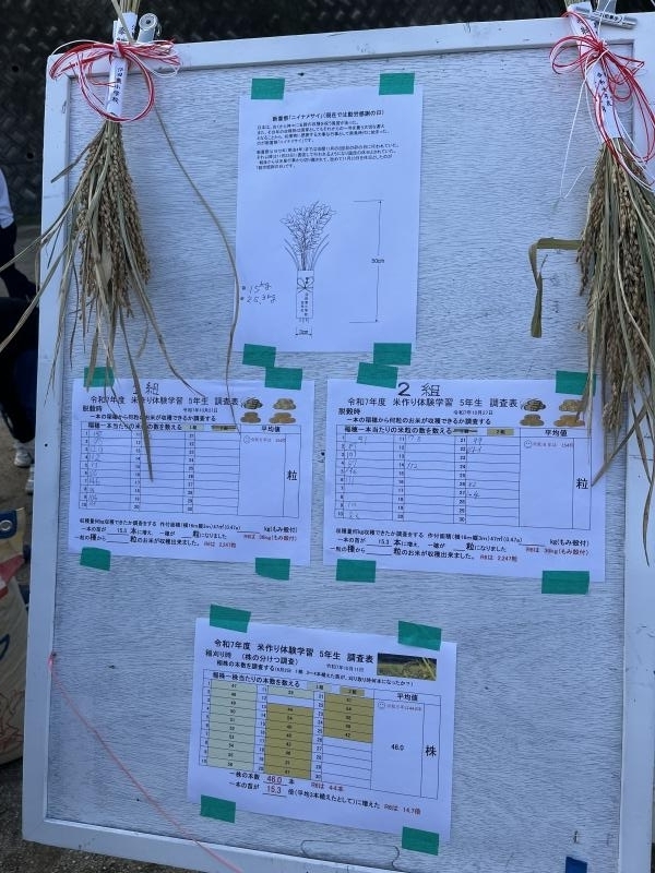 昔の農機具,千歯こぎ、足ふみ脱穀機,唐箕等を使い昨年よりも多い47キロ余りのもみを収穫しました。現在はほとんど使われていない、昔の農具を使っての貴重な体験だったと思います。