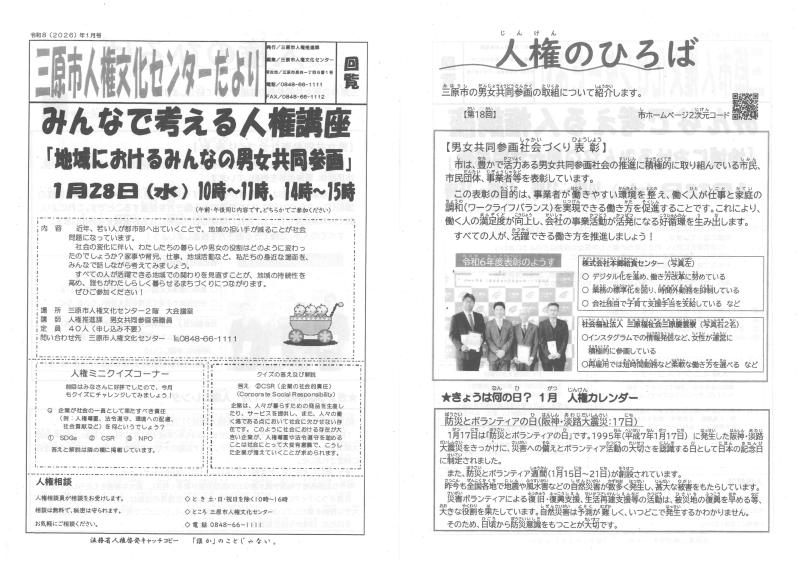 1. 三原市人権文化センターだより / 人権のひろば(令和8年1月号) 三原市人権文化センターが発行する広報誌で、1月28日開催の「みんなで考える人権講座~地域における男女共同参画~」の案内や、人権相談窓口の情報が掲載されています。また、男女共同参画社会づくり表彰の受賞団体紹介や、1月17日の「防災とボランティアの日」についての人権カレンダーも紹介されています。