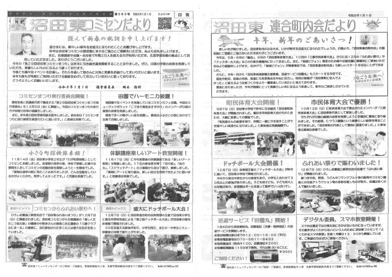 2. 沼田東コミセンだより / 沼田東連合町内会だより(令和8年1月1日号) 沼田東コミュニティセンターと連合町内会の新年号で、運営委員長からの新年挨拶や、第29回田園コミセンまつりの報告が掲載されています。町民体育大会、ドッチボール大会、アート教室、ふれあい祭りなど地域イベントの開催報告のほか、新たに始まる送迎サービス「田園丸」やスマホ教室の案内も紹介されています。