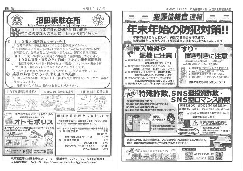 3. 沼田東駐在所だより / 犯罪情報官速報(令和8年1月号・令和6年11月26日) 広島県警の沼田東駐在所が発行する防犯情報で、110番通報の適切な利用方法(緊急時と相談窓口の使い分け)について解説しています。また、年末年始の防犯対策として、侵入強盗・泥棒、すり・置き引き、特殊詐欺やSNS型投資詐欺・ロマンス詐欺への注意喚起が掲載されています。