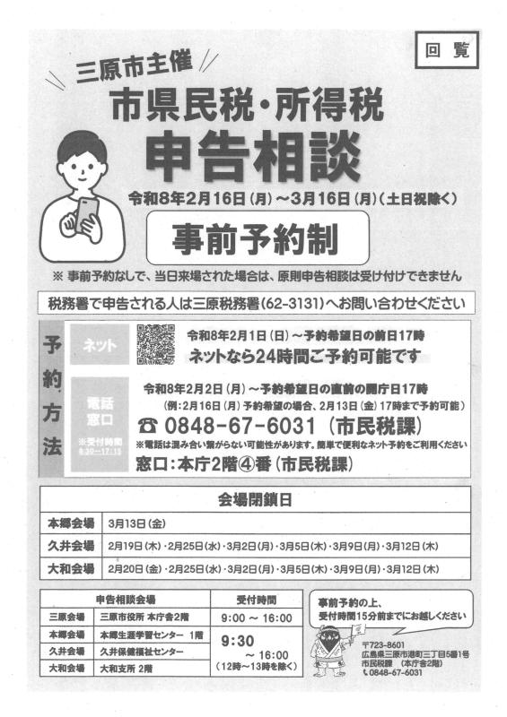 4. 三原市主催 市県民税・所得税 申告相談(令和8年) 三原市が令和8年2月16日(月)~3月16日(月)に実施する市県民税・所得税の申告相談の案内です。今年から事前予約制となり、ネット(24時間対応)または電話(0848-67-6031)での予約が必要です。会場は三原会場(本庁舎2階)、本郷会場、久井会場、大和会場の4か所で、受付時間は9:00~16:00となっています。