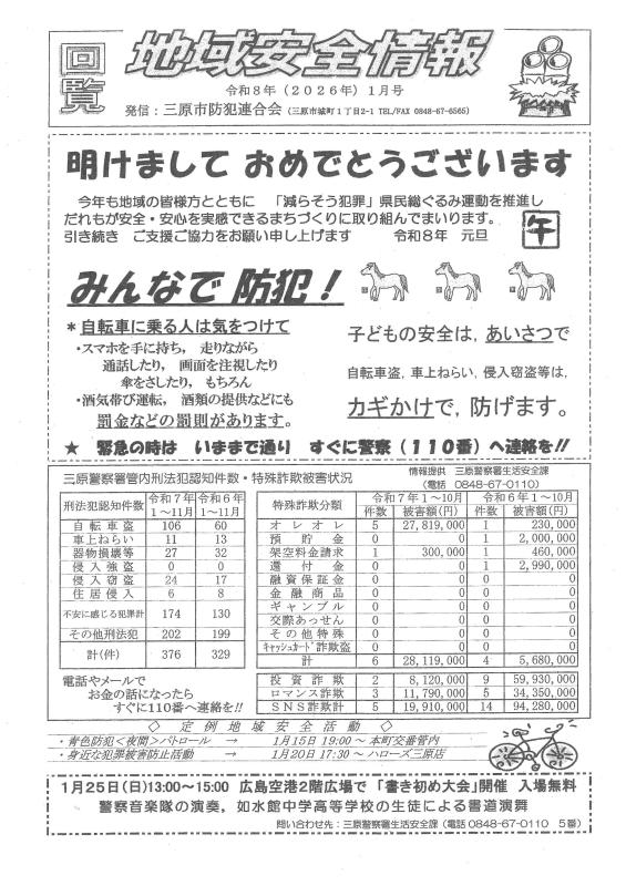 5. 地域安全情報(令和8年1月号)/三原市防犯連合会 三原市防犯連合会が発行する防犯情報誌で、新年の挨拶とともに「減らそう犯罪」県民総ぐるみ運動への協力を呼びかけています。自転車利用時のスマホ操作や飲酒運転への注意、子どもの安全のための挨拶・鍵かけの推進を掲載。また、令和7年1月~11月の刑法犯認知件数(自転車盗106件など)や、SNS詐欺計14件・被害額約9,400万円などの特殊詐欺被害状況も報告されています。